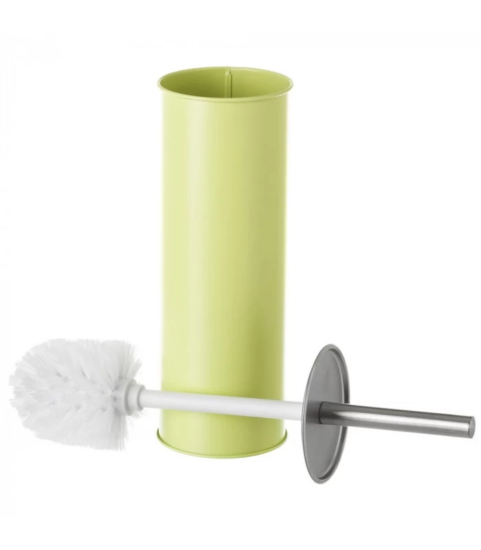 Balai de toilette en métal vert avec récipient intérieur amovible en plastique.
