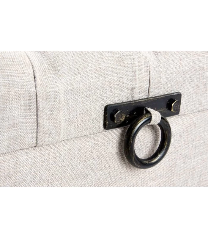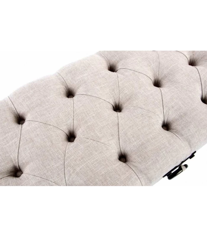 Banquette coffre en polyester beige capitonnée effet lin et structure en bois. Idéale comme bout de lit, cette banquette confortable offre un rangement déco et classique.