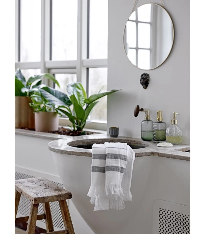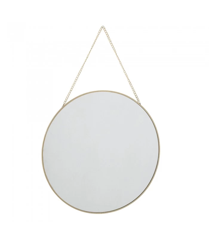 Miroir à suspendre très déco. Ce miroir rond en métal doré est suspendu par une chaînette dorée.