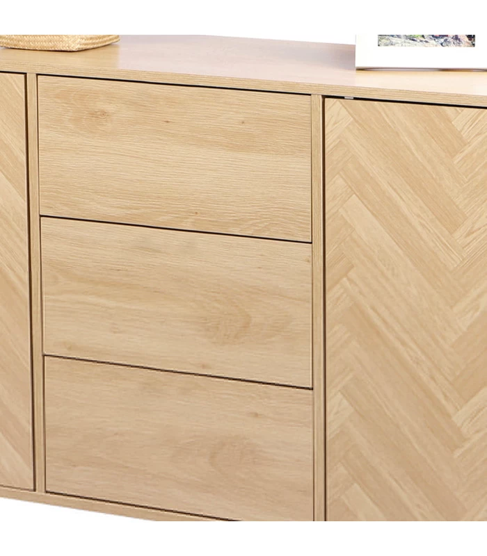 Buffet en bois MDF comprenant 2 portes bois et 3 tiroirs à ouverture à pression.