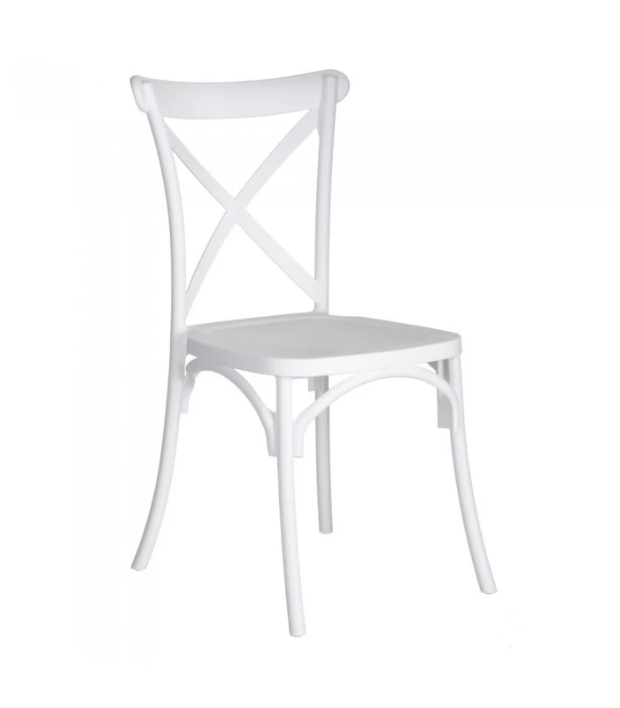 Chaise esprit bistrot en polypropylène blanc, empilable. Une chaise que l’on met aussi bien dehors que dedans.