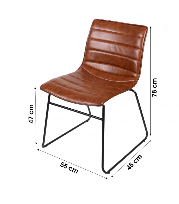 Chaise avec assise rembourrée en similicuir marron esprit vintage et pieds en métal noir.