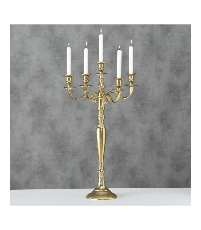 Beau chandelier doré à 5 branches. Ce chandelier en aluminium doré est un bel élément déco et crée une décoration chaleureuse et élégante dans votre intérieur. Ce chandelier de table doré mesure 40cm de hauteur.