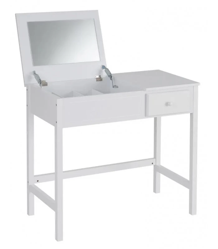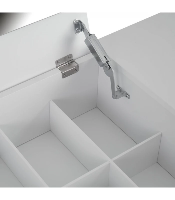 Coiffeuse avec miroir (dimensions miroir: 43.7X27.5cm) vous permettant de vous créer un espace maquillage et coiffure. Pratique, cette coiffeuse en bois comprend 1 tiroir et placard relevable avec 8 compartiments (dimensions de chaque compartiment: 12.5X19.5X8.5cm) vous permettant de ranger vos affaires de maquillage.