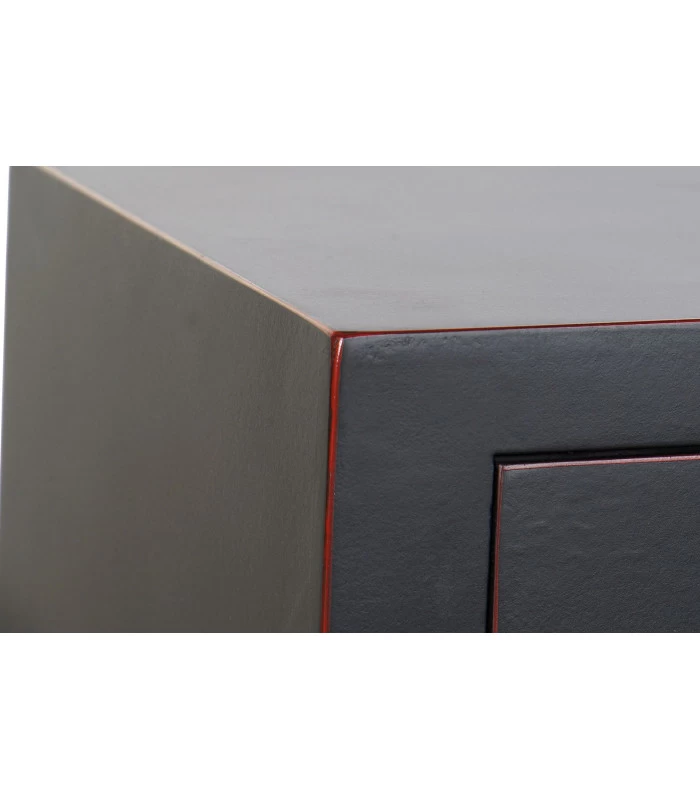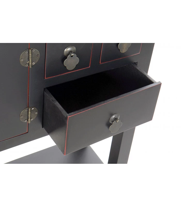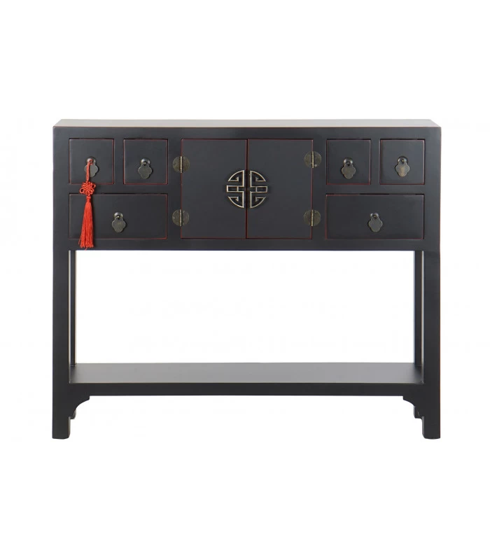 Console style oriental en bois noir comprenant 6 tiroirs et un placard à 2 portes.
