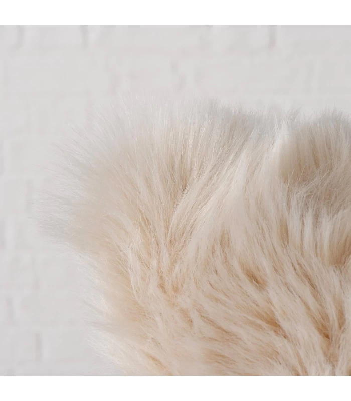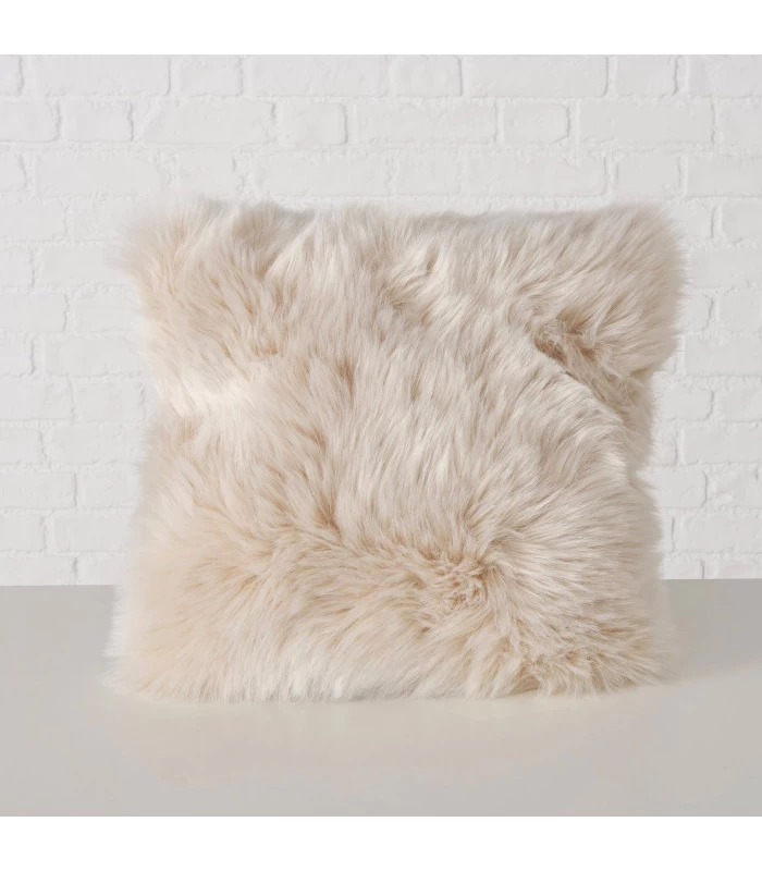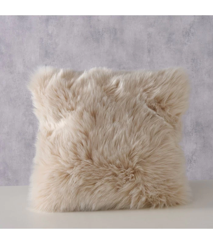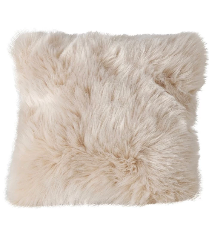 Coussin en fausse fourrure beige. Déhoussable avec fermeture éclair cachée. Lavable jusqu’à 30 degrés.