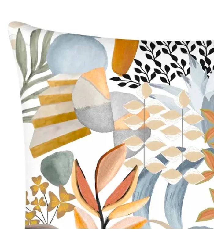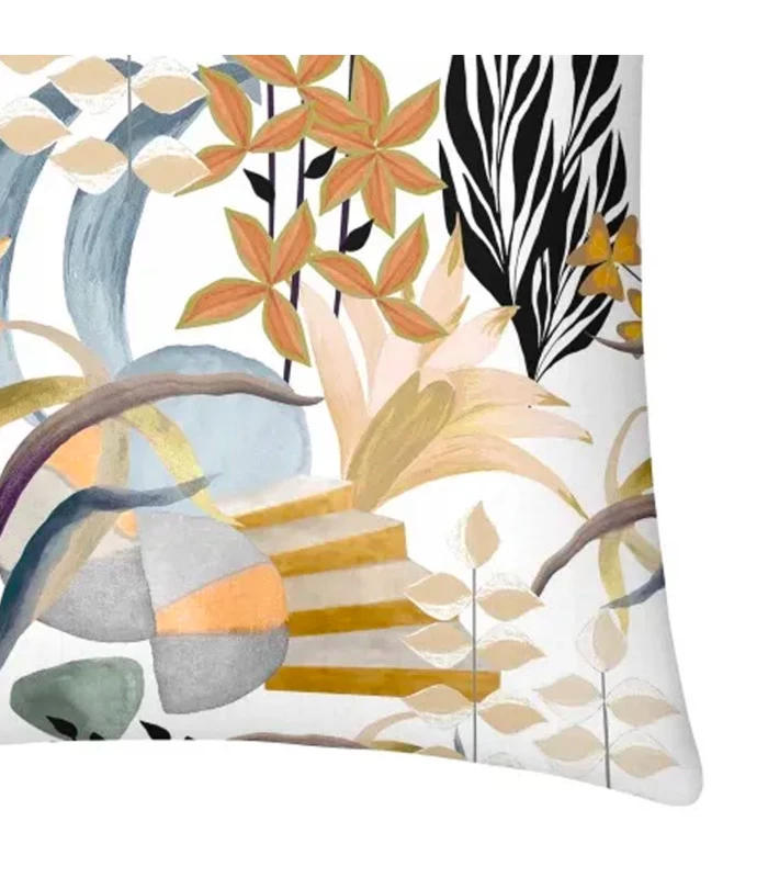 Coussin en tissu motif fleuri multicolore. Déhoussable avec fermeture éclair cachée.