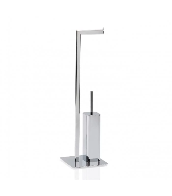 Ensemble pour WC comprenant un dérouleur de papier toilette et une brosse WC. Ce support pour papier WC sur pied présent la particularité d’avoir un pied carré et un rangement pour la brosse carré avec bords arrondis. Cet ensemble pour WC est élégant et épuré et de bonne qualité permettant un nettoyage facile et efficace. Ensemble chromé.