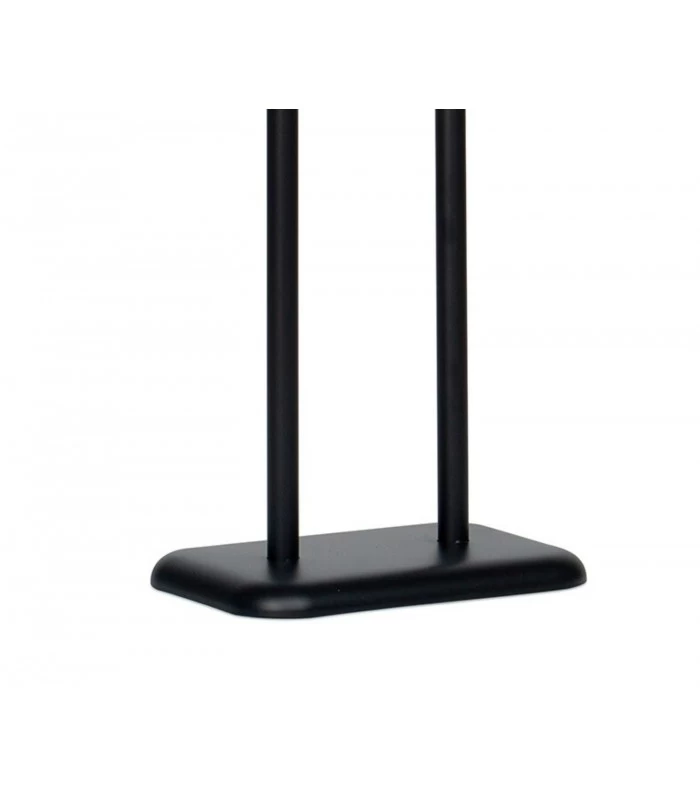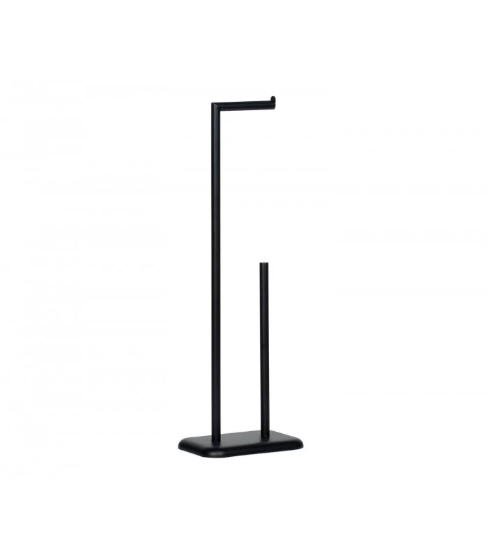 Dérouleur de papier toilette sur pied en métal noir et emplacement pour mettre des rouleaux en réserve.