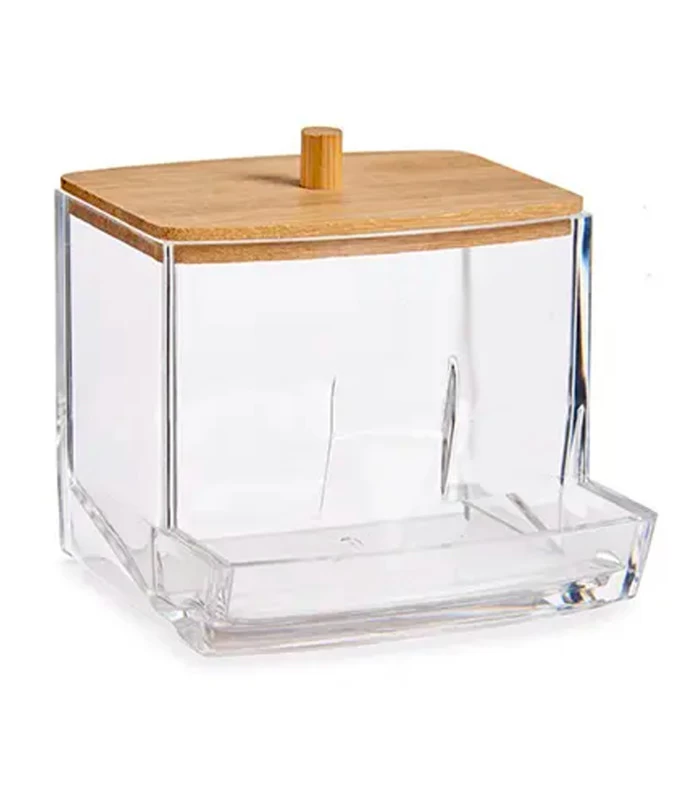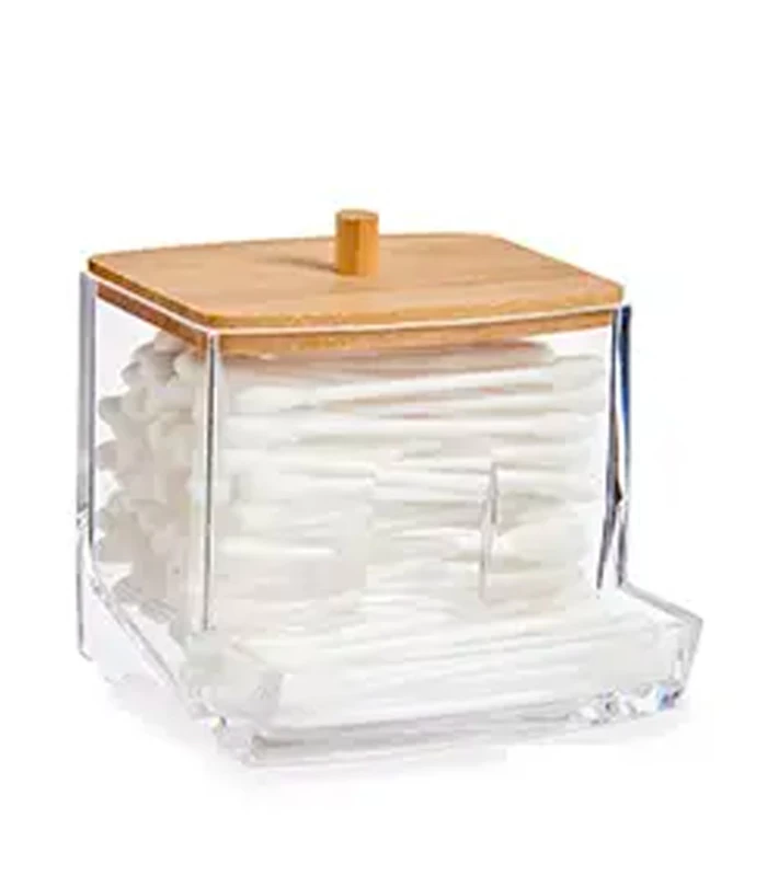 Élégante boîte distributrice coton-tiges en bambou et acrylique.