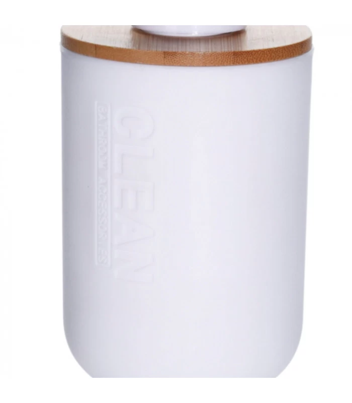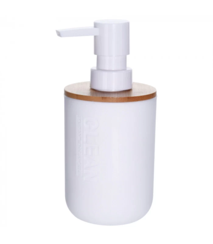 Distributeur de savon de salle de bain en plastique blanc et bambou.