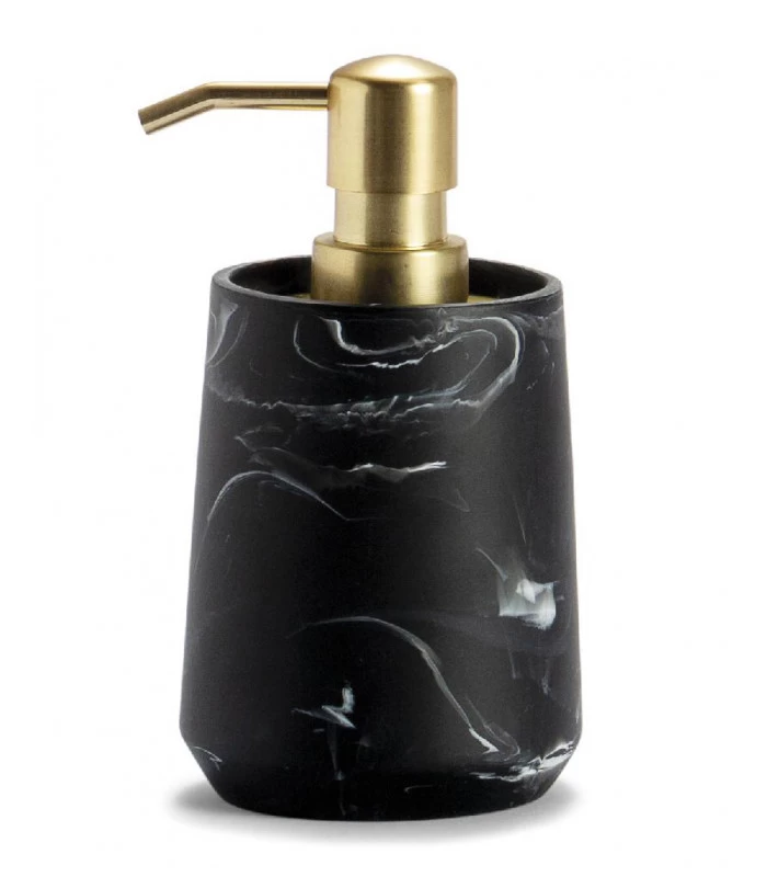Distributeur de savon en polyrésine noire et métal doré, à assortir avec les autres éléments de le gamme pour salle de bain.