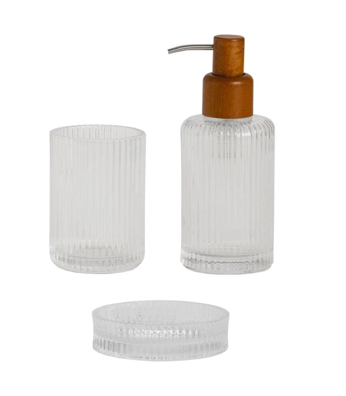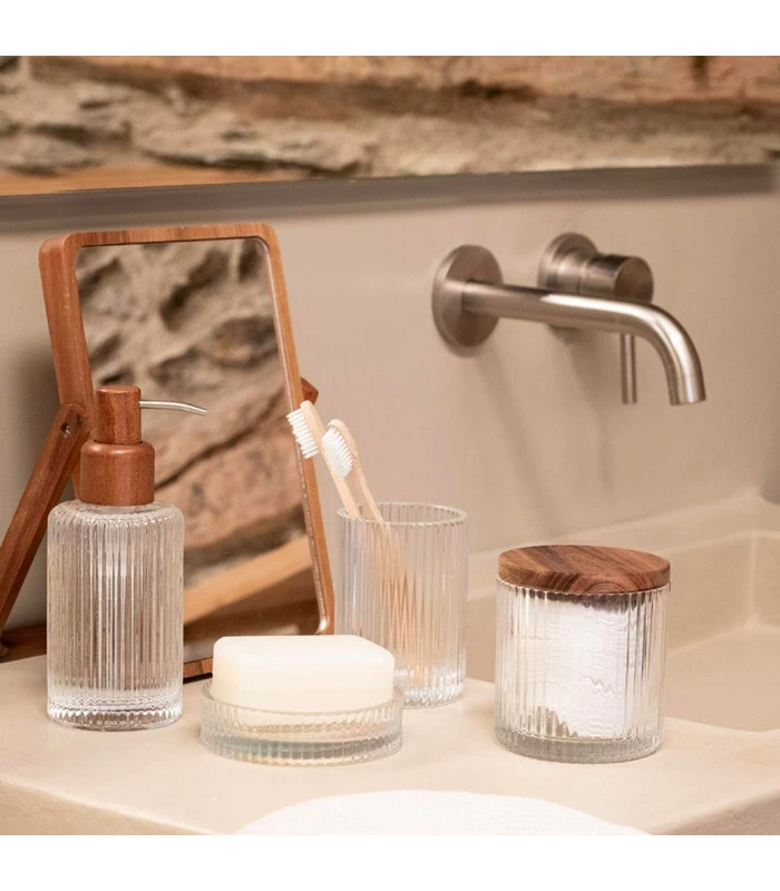Distributeur de savon en verre strié et bois d’acacia, à assortir avec les autres éléments pour salle de bain.