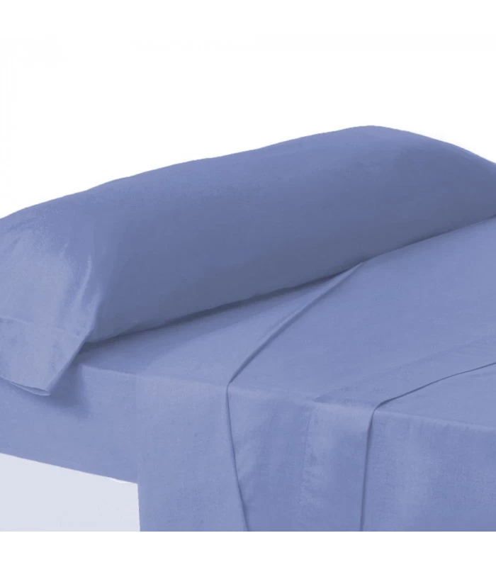 Drap housse bleu en coton et polyester.
