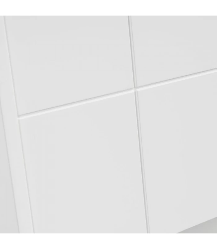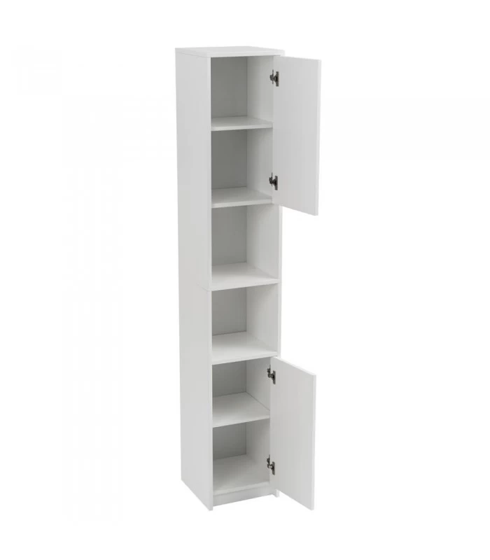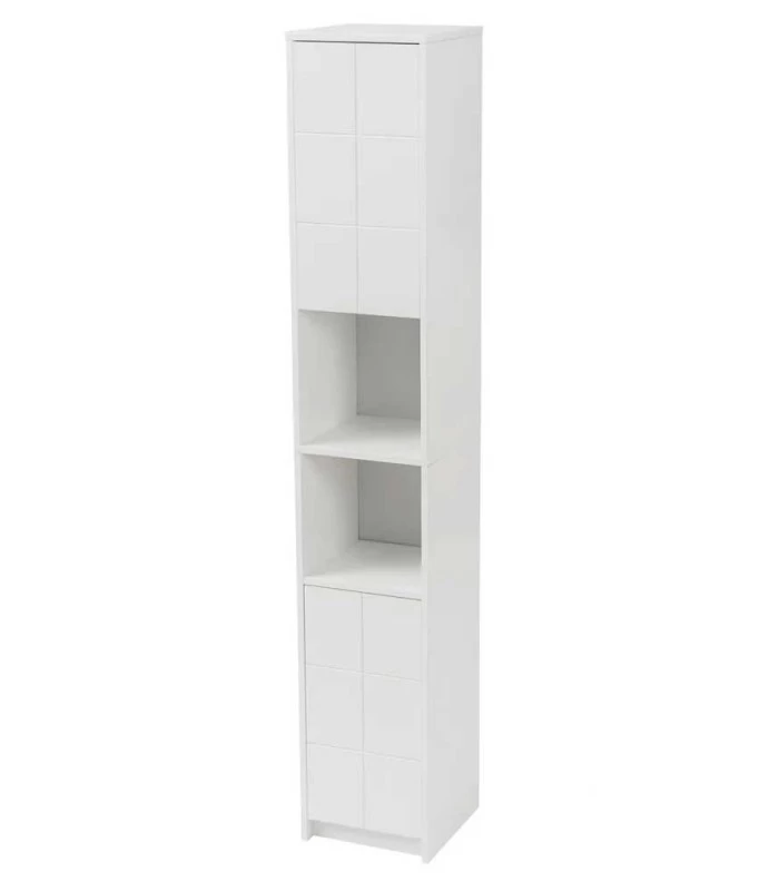 Étagère colonne de salle de bain en bois blanc avec 2 placards et étagères. Dimensions des portes de placard: 26.5x53cm