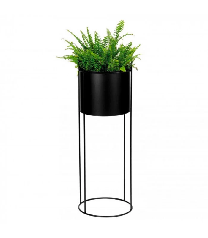Jardinière sur pied ronde en métal noir, idéale pour disposer des plantes. Apporte une touche moderne et élégante.