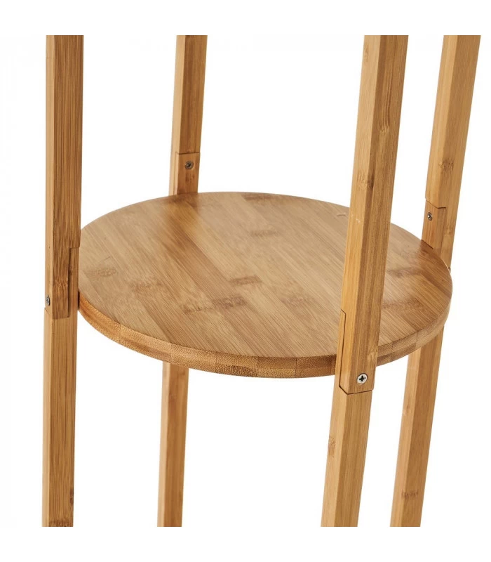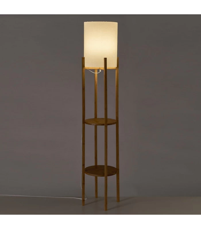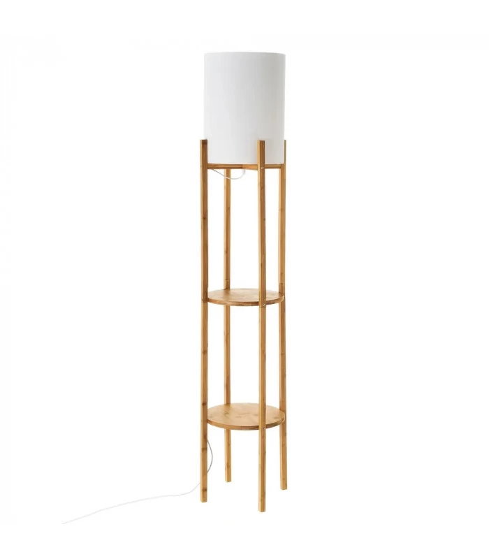 Lampadaire étagère composé d’une structure en bambou et d’un abat-jour blanc.