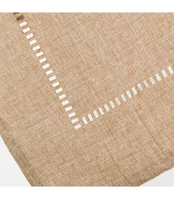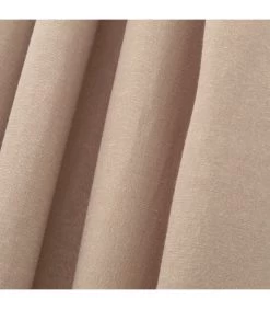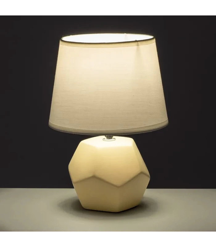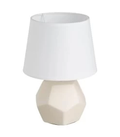 Petite lampe à poser avec base en céramique beige et abat-jour tissu blanc.