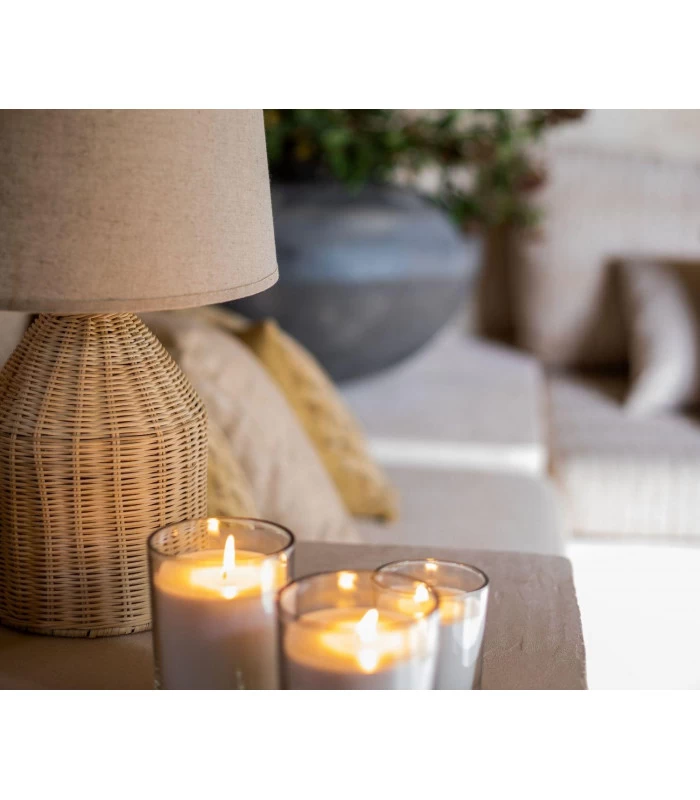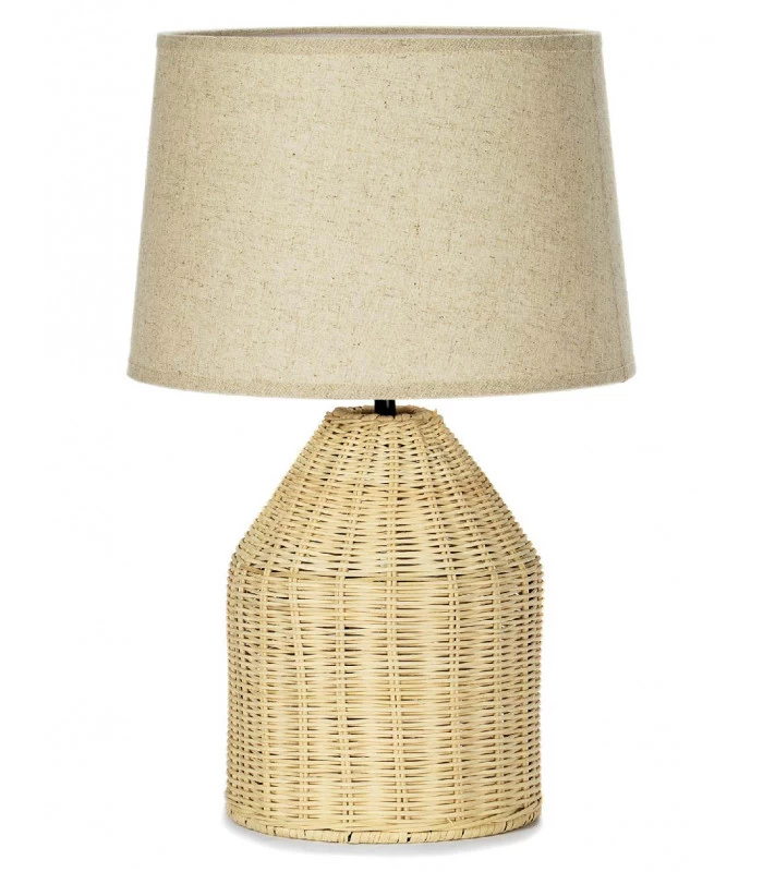 Très belle lampe à poser en rotin et abat-jour beige en tissu.