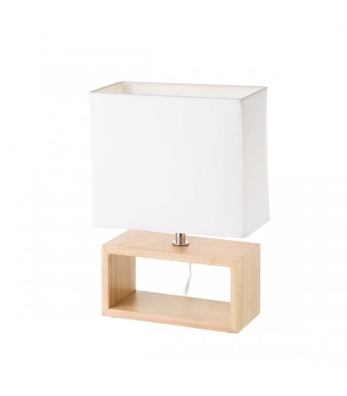Lampe de chevet ou lampe d’appoint avec base en bois et abat-jour blanc.