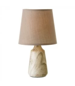 Petite lampe à poser avec base ronde en céramique effet bois et abat-jour tissu taupe.