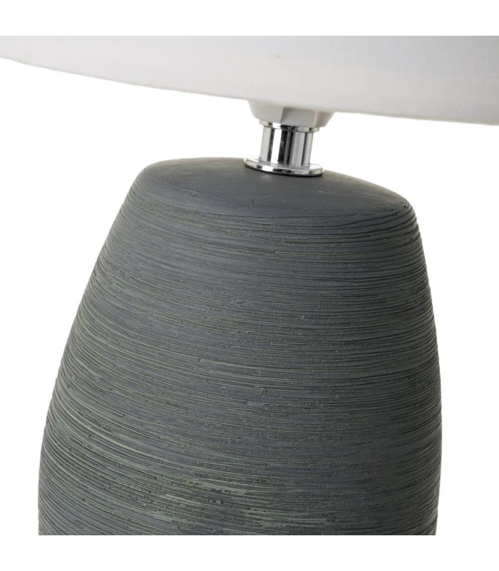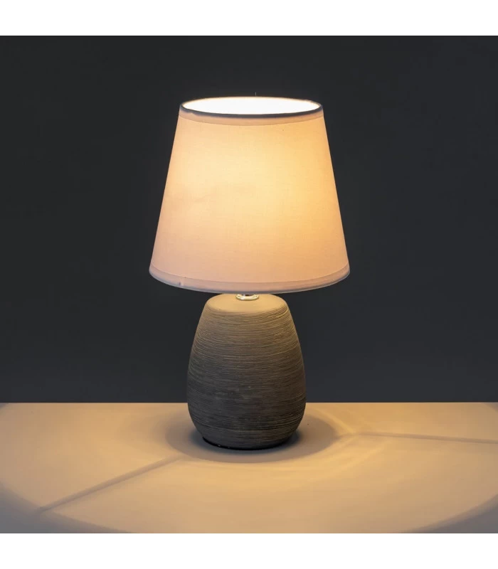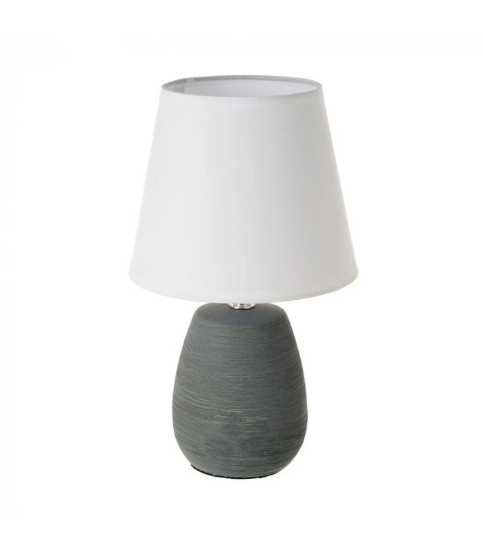 Petite lampe à poser avec base ronde en céramique grise et abat-jour tissu blanc.
