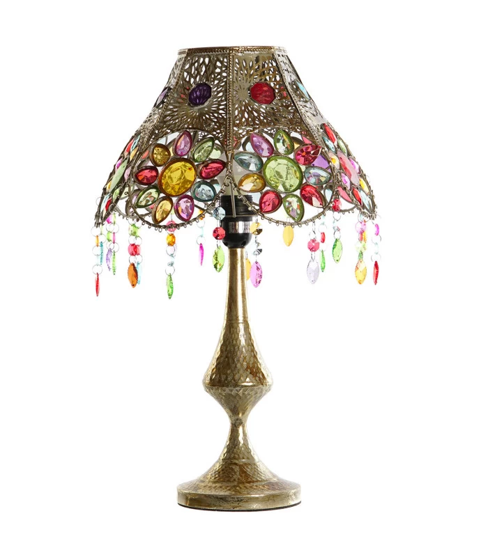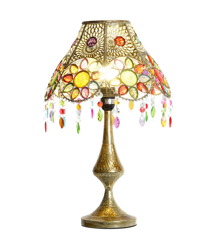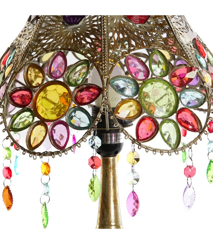 Très belle lampe style oriental composée d’un pied métal doré et d’un abat-jour doré avec décorations en acrylique multicolore.