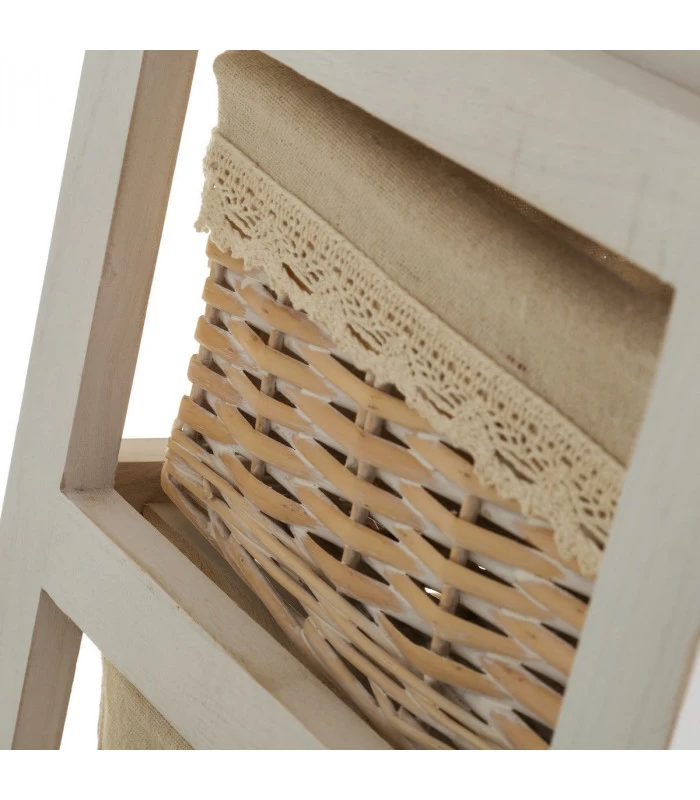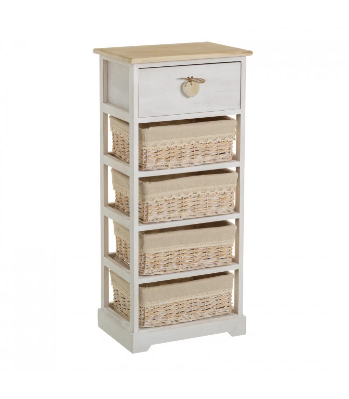 Meuble de rangement bois et blanc comprenant 1 tiroir avec poignées coeur et 4 paniers tressés avec intérieurs en lin.