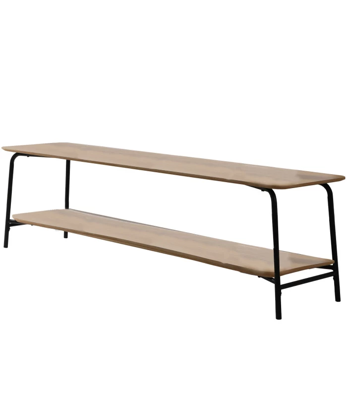 Meuble de télévision sobre et élégant à deux niveaux en bois mdf et métal noir. Idéal pour poser une télévision dessus ou pour mettre sous une télévision murale.
