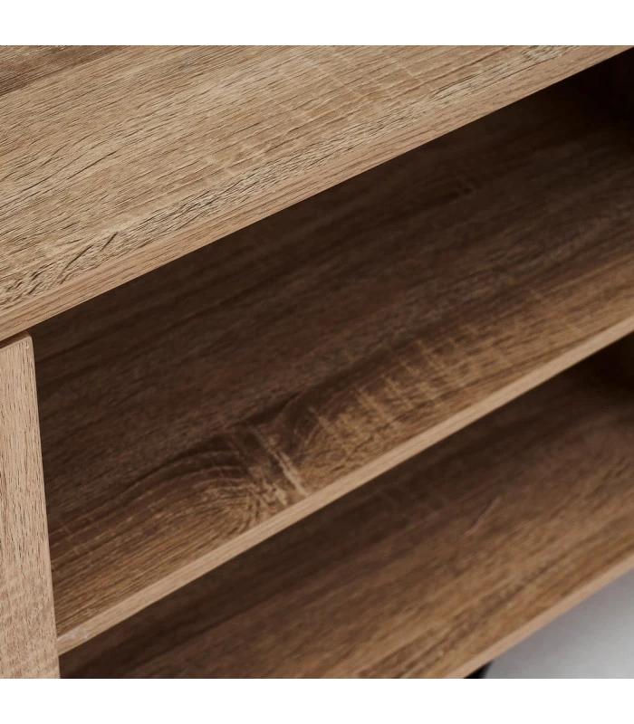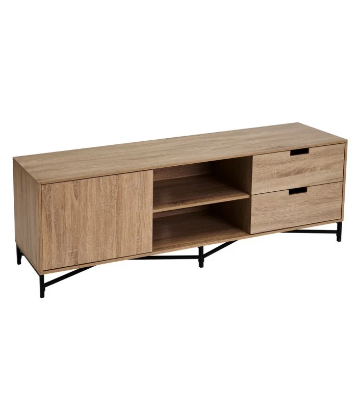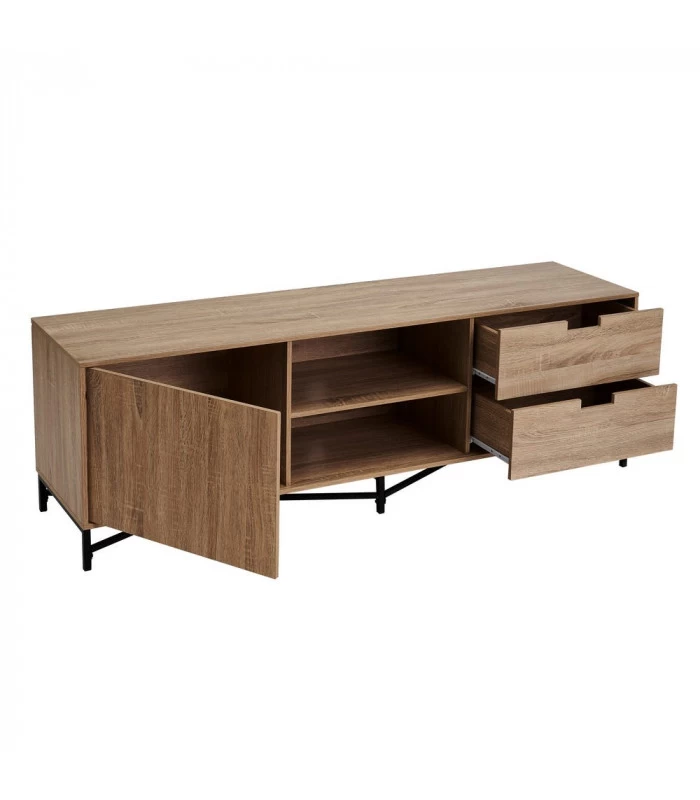 Meuble de télévision sobre et élégant en bois MDF comprenant 1 placard, 2 tiroirs et 2 étagères.