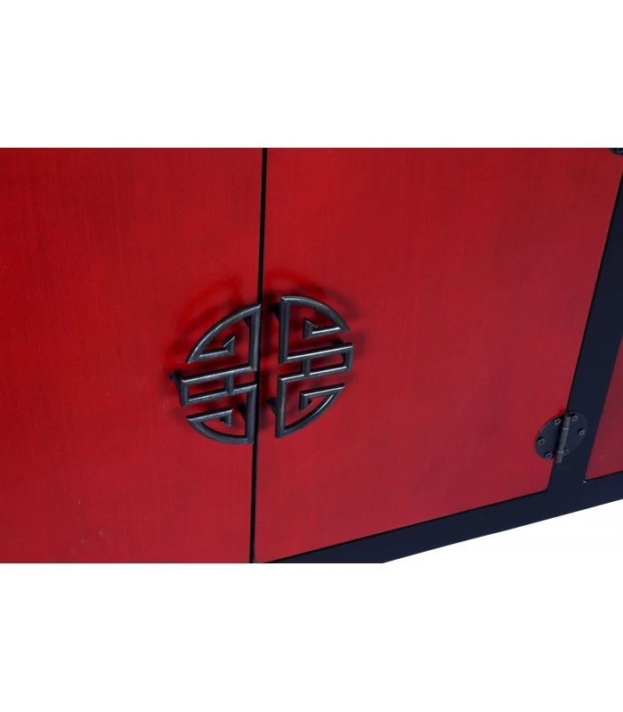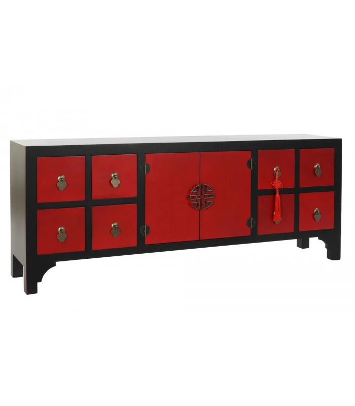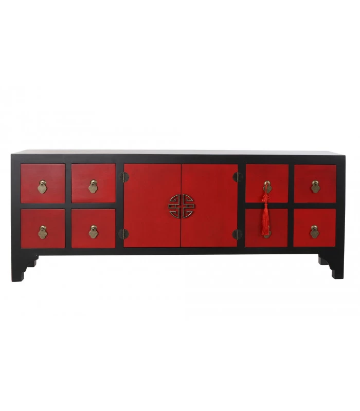 Meuble de télévision sobre et élégant esprit chinoiserie en bois noir et rouge comprenant 8 tiroirs et un placard à 2 portes.