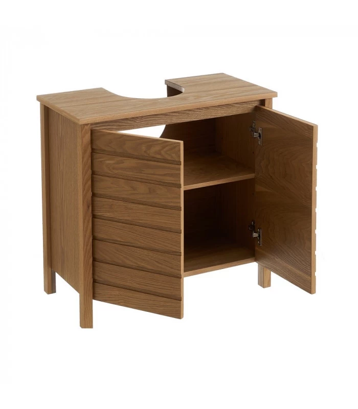 Meuble de salle de bain sous vasque/lavabo en bois placage frêne comprenant 2 portes et 2 étagères à l’intérieur (percées pour laisser passer la tuyauterie). Chaque étagère peut supporter jusqu’à 10kg.