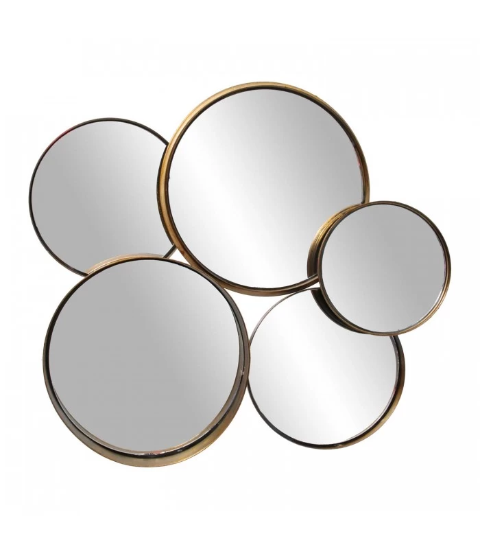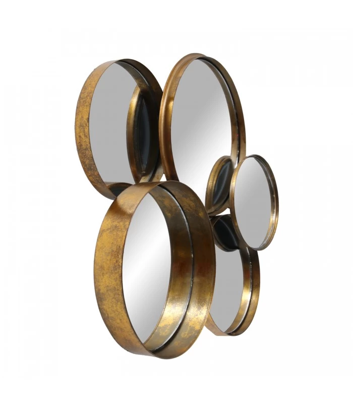 Miroir mural composé de 5 cercles avec pourtour en métal doré effet vieilli.