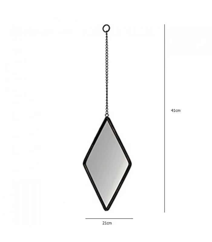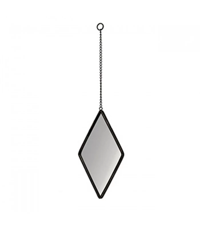 Miroir losange mural en métal noir suspendu par une chaîne en métal noir.