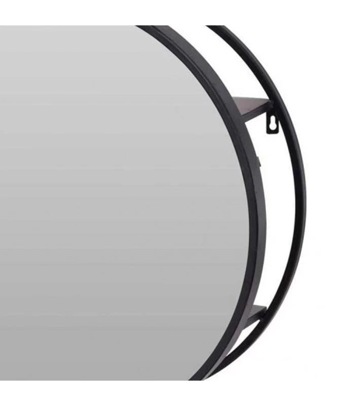 Miroir simple et élégant rond en métal noir avec étagères qui habille votre mur. Idéal pour une entrée ou une salle de bain.