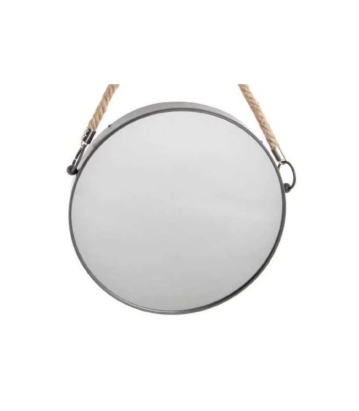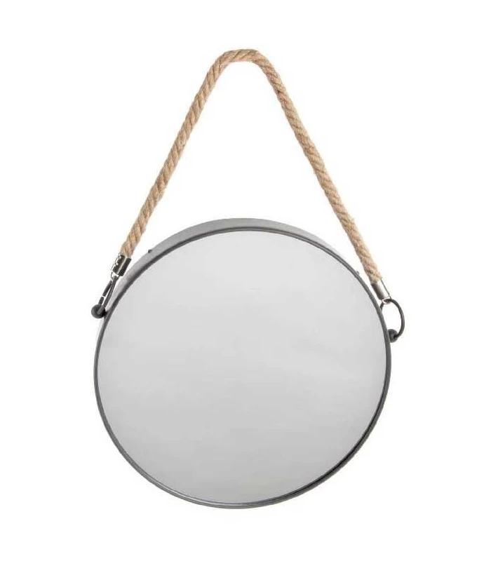 Miroir décoratif en métal noir rond suspendu par lanière en corde.