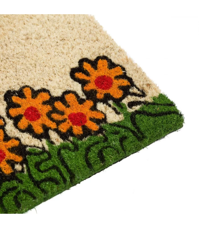 Paillasson en coco avec inscription ‘Welcome’ et décoration florale avec vélo.