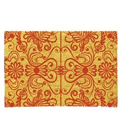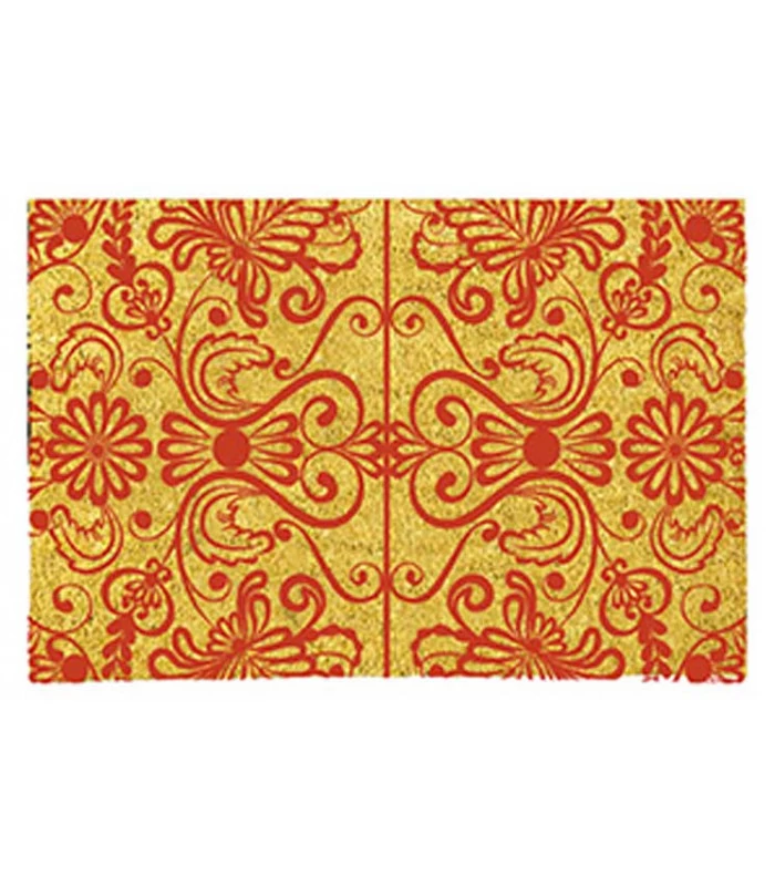 Paillasson en coco avec motifs rouges.