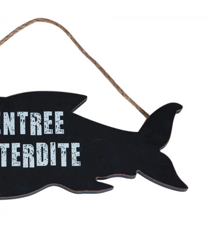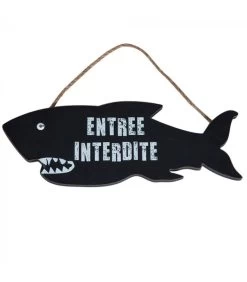 Panneau suspendu par une corde en bois en forme de requin entrée interdite.