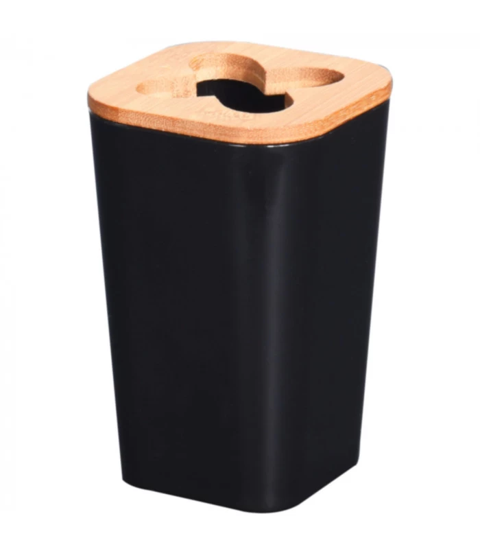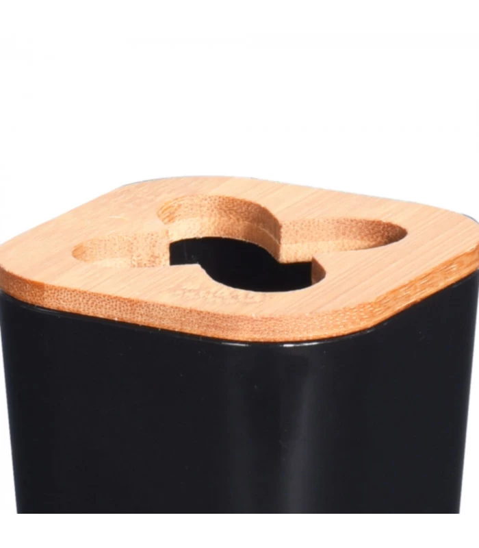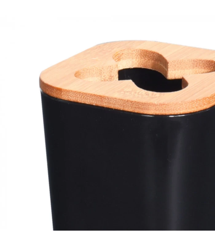 Porte brosses à dents en plastique noir et bambou.