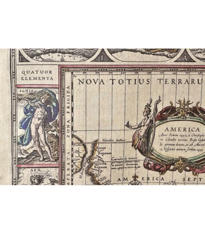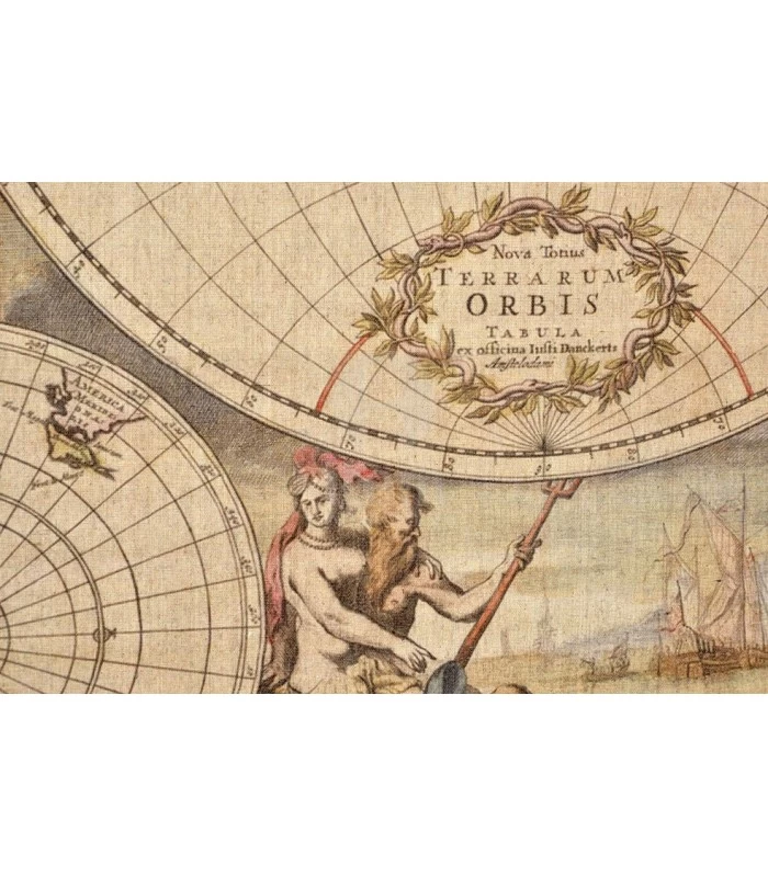 Set de 2 cartes du monde anciennes sur toile en lin à suspendre avec baguettes bois.