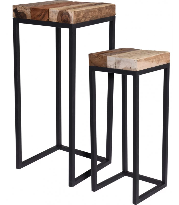 Set de 2 sellettes en métal noir et bois recyclé. Idéal pour déposer de la décoration, un vase, une plante ou autres objets de décoration.