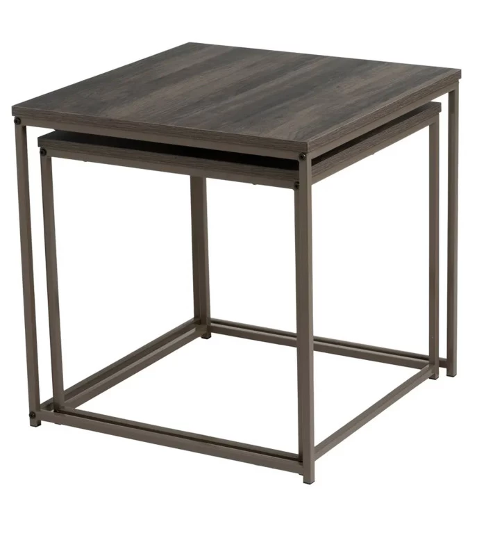 Set de deux tables basses gigognes en bois et métal gris. Ce jeu de 2 tables basses apporte une touche déco chaleureuse.
