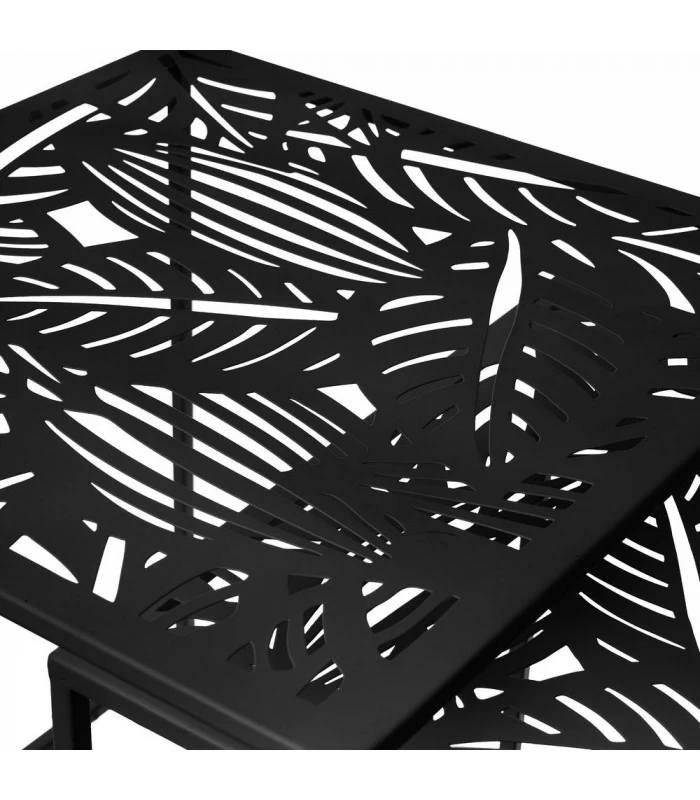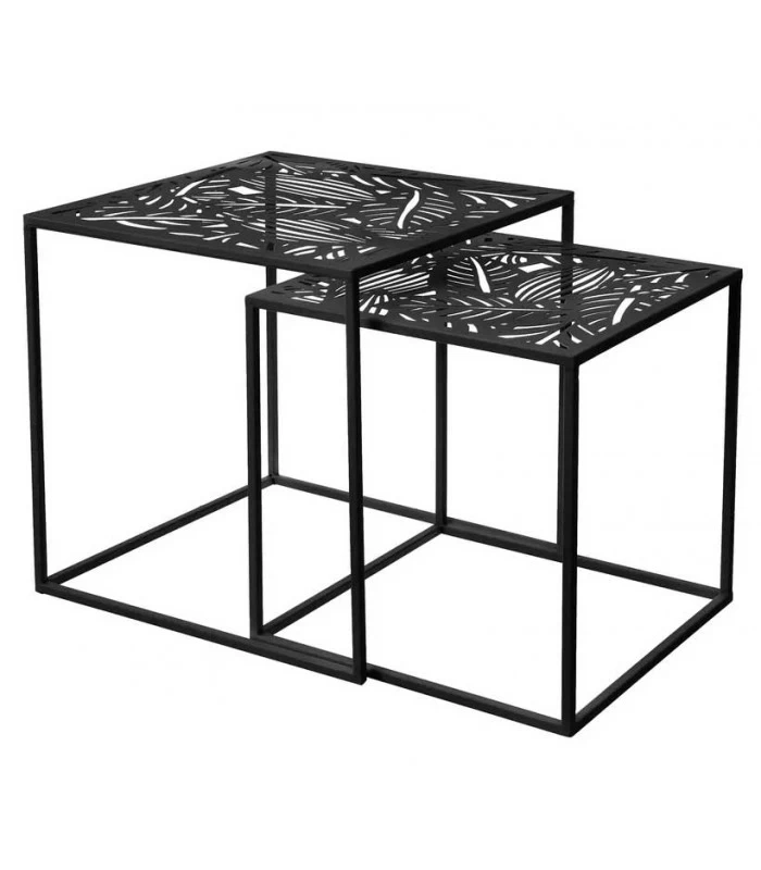 Set de deux tables basses gigognes en métal noir ajouré motif feuillage.