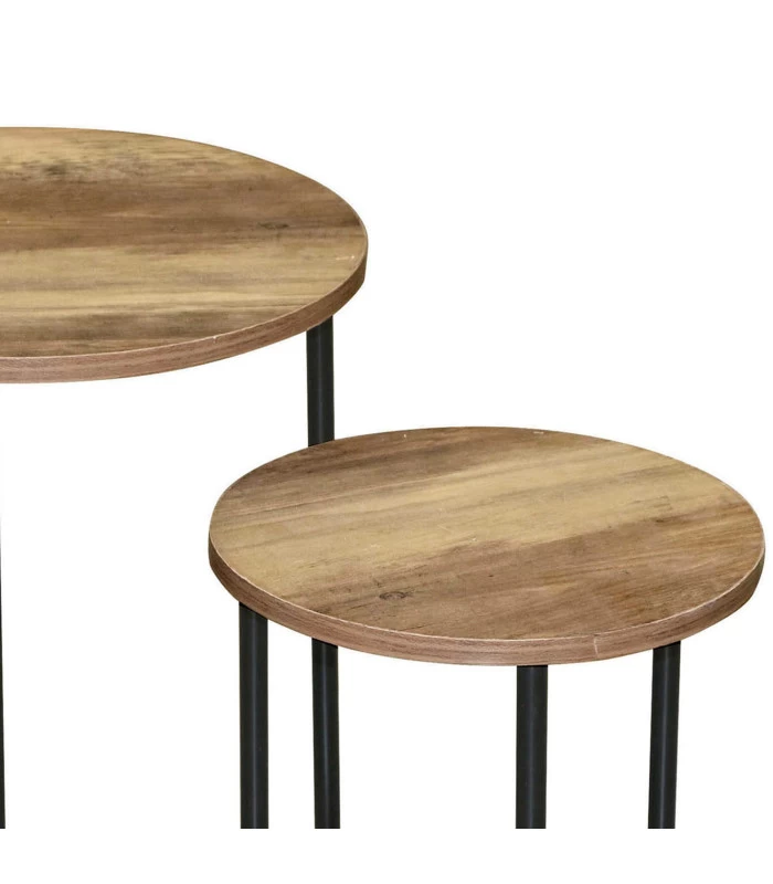 Set de deux petites tables basses gigognes rondes en bois mdf et métal noir. Idéales comme tables d’appoint dans un salon.