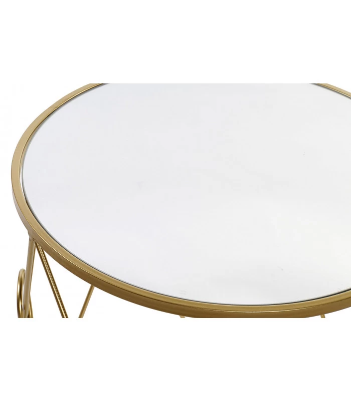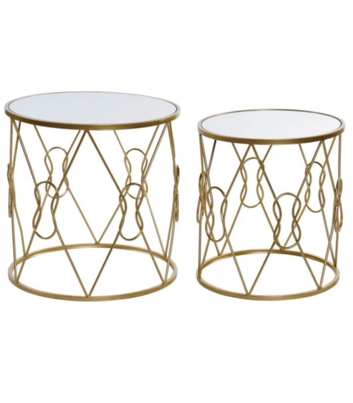Set de deux tables d’appoint rondes avec structure en métal doré et plateaux miroir.