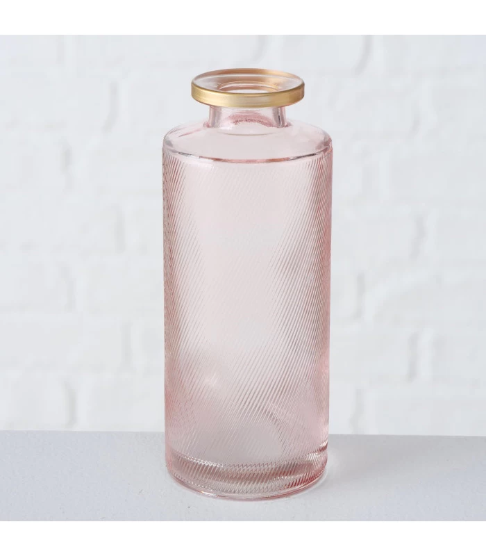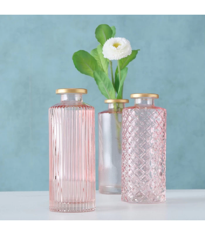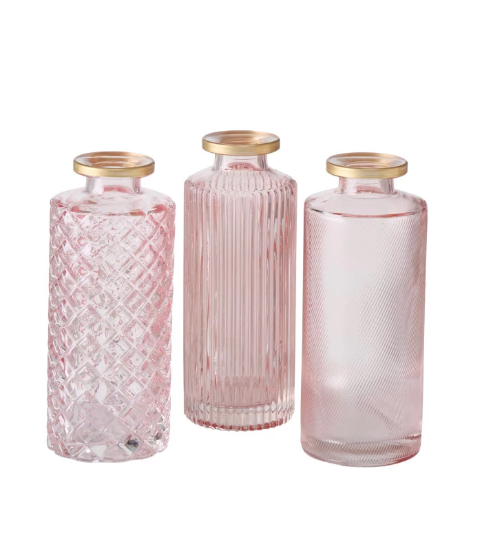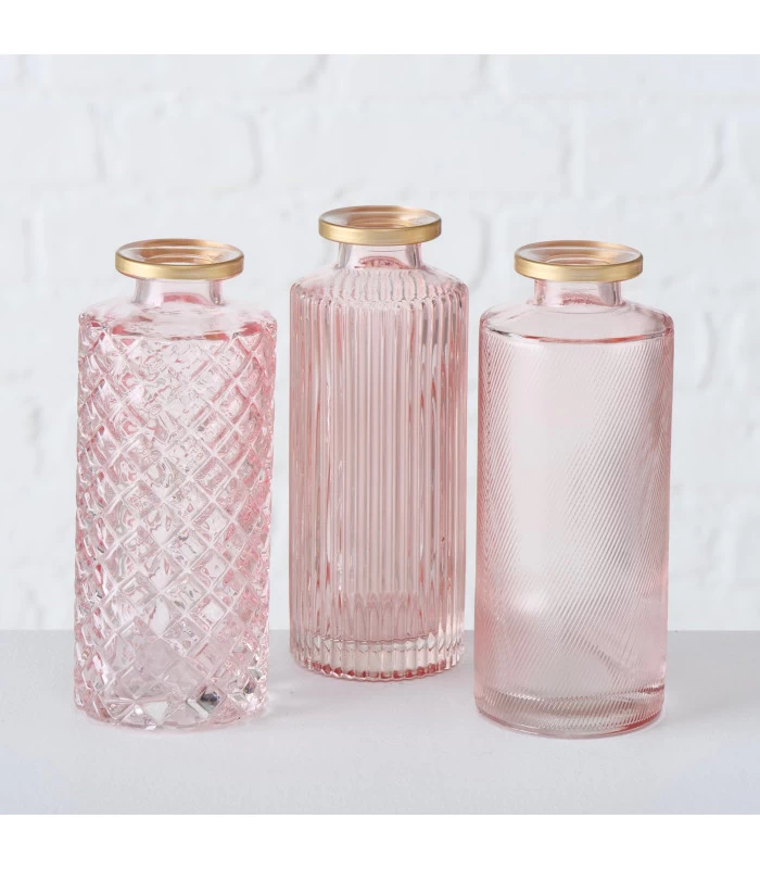 Set composé de 3 petits soliflores en verre à motifs embossés.