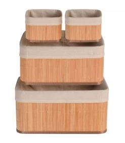Set de 4 paniers de rangement en bambou et intérieur en toile de lin pour organiser la salle de bain.