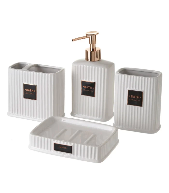 Set pour Salle de bain comprenant 1 distributeur de savon, un porte-brosse à dents, un gobelet, et un porte savon.
