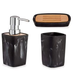 Set Salle De Bain Plastique Effet Marbre Noir Et Bambou – 3 Pièces